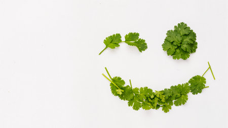 Fresh cilantro leaves arranged playfully to create a cheerful smiley face design.