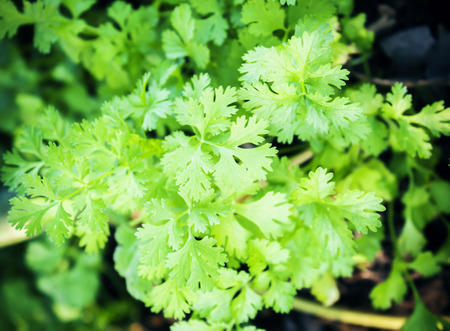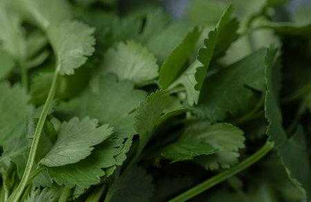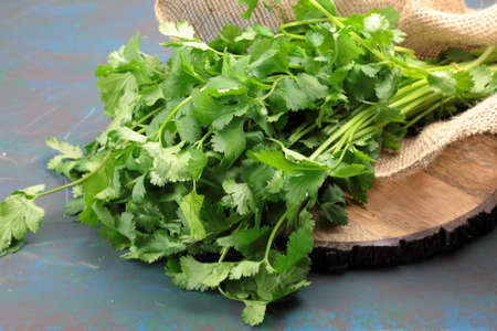 Fresh bunch organic coriander leaves on green leaf background