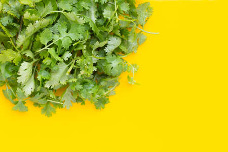 Fresh coriander leaves on yellow background.