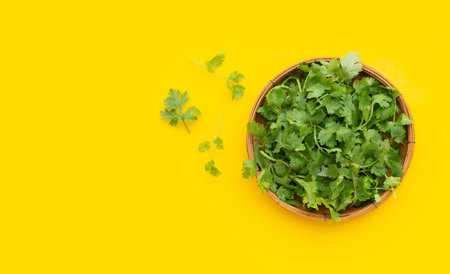 Fresh coriander leaves in bamboo basket on yellow background.
