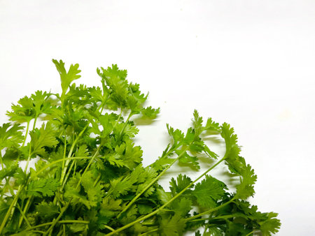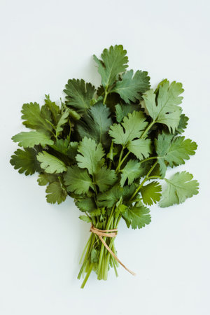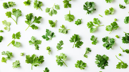 A beautiful arrangement of fresh cilantro leaves spread on a white background. Ideal for culinary, cooking, or health-related imagery.