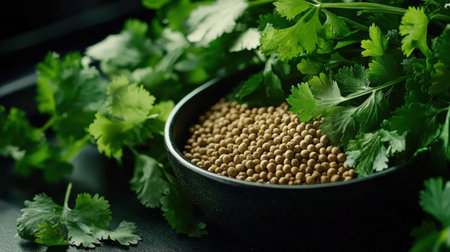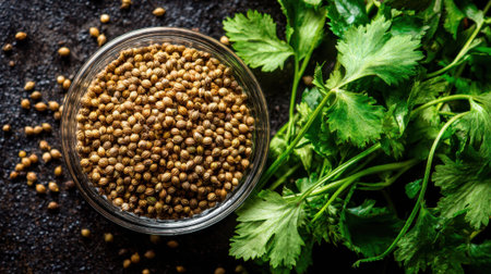 Coriander seeds are stored in a clear bowl beside fresh cilantro leaves on a dark surface. This setup highlights the ingredients commonly used in various recipes.