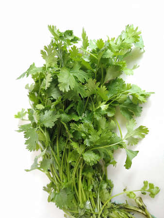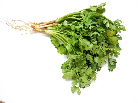 A bunch of fresh coriander on a white background