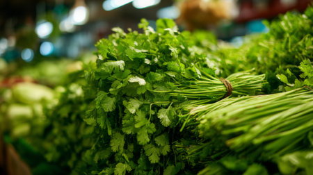 A close-up image showcasing vibrant stacks of fresh cilantro in a bustling market. Ideal for culinary projects, this visual captures the essence of natural ingredients and healthy cooking.