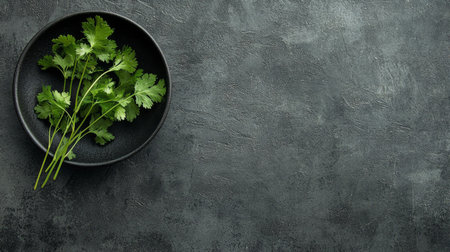 A vibrant arrangement of fresh cilantro leaves in a dark bowl on a textured backdrop. Ideal for culinary projects, food blogs, or healthy lifestyle themes.