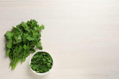 Fresh green cilantro on white wooden table, flat lay. Space for text