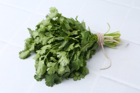 Bunch of fresh aromatic cilantro on white tiled table, closeup