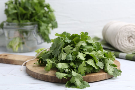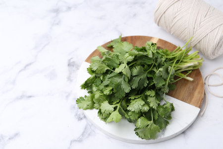 Fresh aromatic cilantro, cutting board and thread on white marble table. Space for text