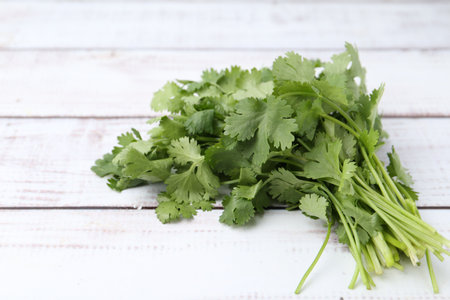 Fresh aromatic cilantro on white wooden table, closeup