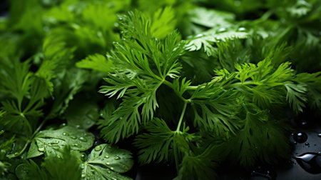 Fresh coriander leaves with water drops on dark background. Top view.