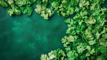 Coriander leaves on green background. Top view. Copy space