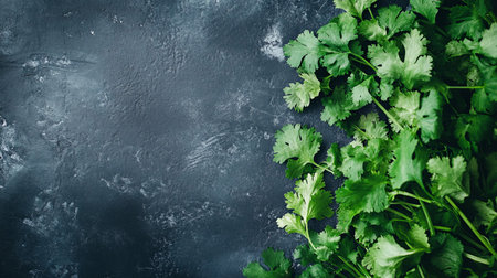 Coriander leaves on dark background, top view, copy space