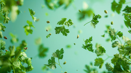 Fresh cilantro leaves floating against a soft green backdrop create a vibrant, lively atmosphere
