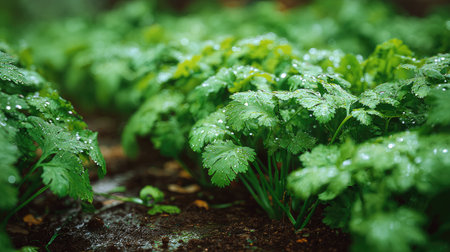 A panoramic wide view of Cilantro garden growing closely together after rain wet leaves reflecting soft light fresh soil visible ultra realistic photography cinematic wide composition lifelike natural scene