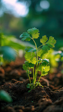 Coriander with small fresh leaves, growing upright in fertile soil, sunlight filtering gently, realistic textures, vibrant green tones, natural photography style, wide balanced composition