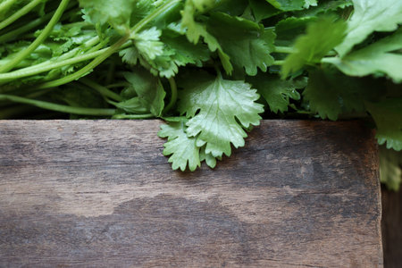 fresh green coriander leaves on wooden background,