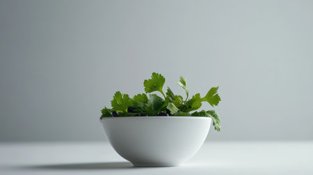 A vibrant cilantro arrangement in a white bowl against a minimalist background, perfect for culinary aesthetics, healthy cooking themes, or food styling.