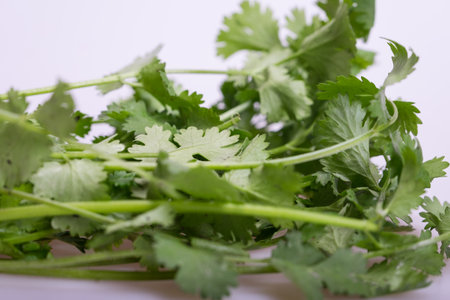 Coriander leaves on a white background. Close-up.