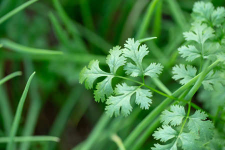 Green coriander leaves close up. Selective focus. nature.