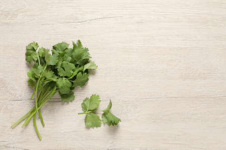 Bunch of fresh aromatic cilantro on white wooden table, flat lay. Space for text
