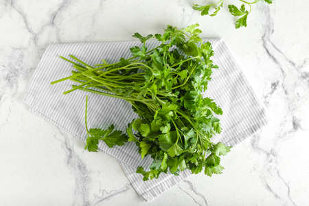 Green fresh parsley on marble background