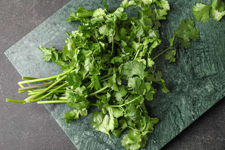 Bunch of fresh aromatic cilantro on gray table, top view