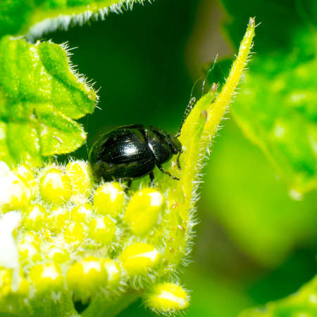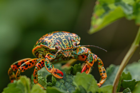 Black beetle perched on vibrant leaves, showcasing intricate details and textures. Nature and entomology concept with green background.