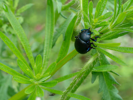 Timarcha nicaeensis, beautiful leaf beetle with iridescent blue reflections. Female on Gallium aparine, goosegrass.