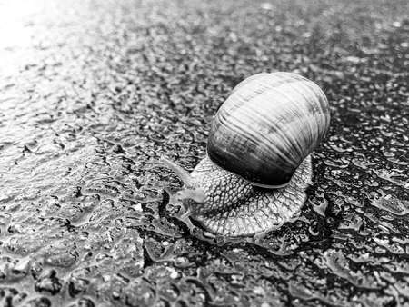 Big garden snail in shell crawling on wet road hurry home, snail Helix consists of edible tasty food coiled shell to protect body, natural animal snail in shell from slime can made nourishing cream