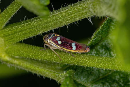 Closeup on a nymph of the Wheat bug, Aelia rostrata, sitting on a piece of wood