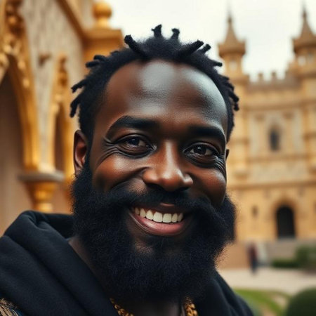 A young man wearing a golden robe and ornate headwear sits serenely in a lush outdoor setting surrounded by greenery.