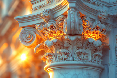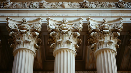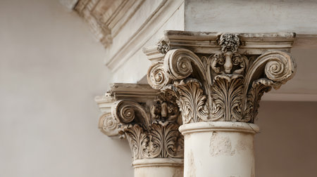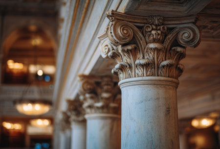 This image showcases a row of classical columns with detailed floral capitals. The warm color palette and soft lighting suggest an indoor setting. The composition emphasizes the architectural details, with a blurred background. Suitable for various design projects and editorial content.