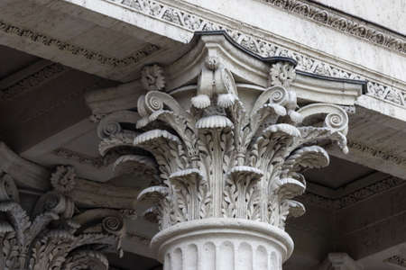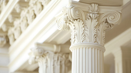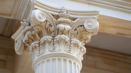 Close-up of an intricately carved white marble Corinthian column in a grand classical building. Architectural detail and heritage.