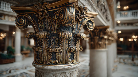 An ornate marble column with intricate golden Corinthian capital details, showcasing luxurious classical architecture