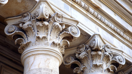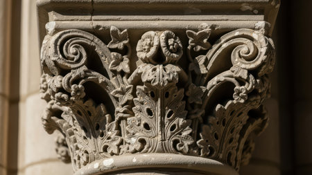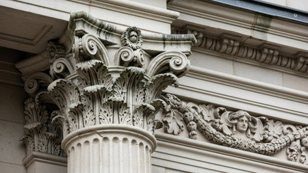 An architectural detail features a classical column capital alongside a decorative building facade. The composition highlights intricate carvings, textured surfaces, and a muted color palette. The scene presents exterior daylight conditions. Suitable for illustrating architectural design, historical themes, or background elements in various commercial projects.