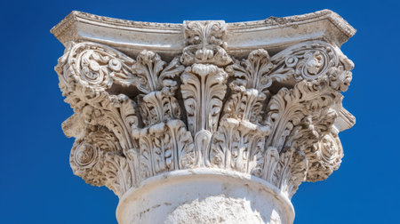 This image showcases a close-up of a Corinthian column capital, highlighting intricate details and the weathered texture of the stone, ideal for architecture and history themed projects.