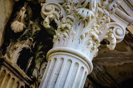 Detail of an ancient corinthian column showing intricate carvings and the effects of time and weathering