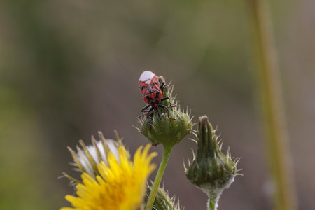 Macro photo of the insect Pyrrhocoris apterus on a flower.Macro photo of the insect Pyrrhocoris apterus on a flower