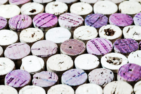 Many wine corks standing on edge. Close up, shallow depth of field. Different sizes, colors and shapes.