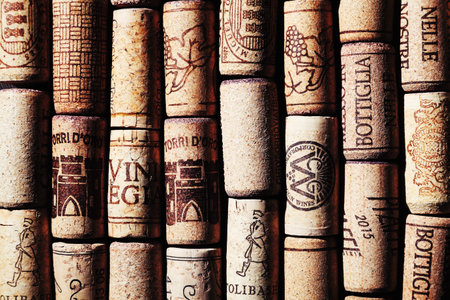 St. Petersburg, Russia-August 16, 2018: corks from the collection of American dry wines presented at the tasting.