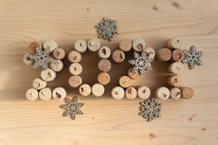 Wine corks stacked as the date of the 2020 retro style. Christmas background