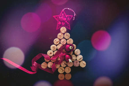 Wine corks Christmas tree with purple star and ribbon decoration, bokeh background, top view. New years and xmas alcohol drink, holiday party, greeting card
