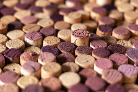 Close up of many extracted wine corks with various intensity red color and focus on 2020 marking