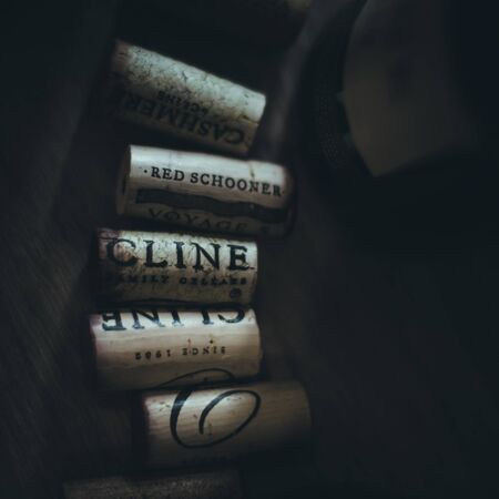 SAINT PETERSBURG, RUSSIAN FEDERATION - AUG 16 2018: corks from just opened bottles of wine Cline Family Cellars.