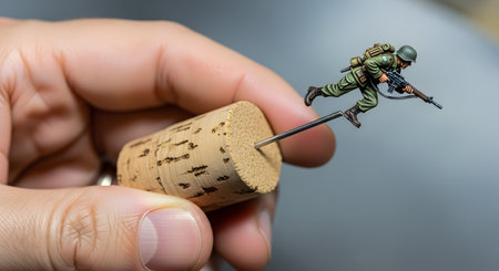 A close-up shot of a hand holding a wine cork, which is used as a stand for a meticulously painted miniature soldier figurine. The running WWII-era soldier is highly detailed, showcasing the hobby of model painting and wargaming.