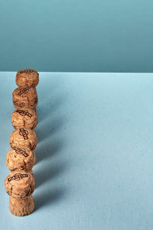 Six wooden Asti Martini champagne corks, lined up in a row, with beautiful shadows, standing on the bluish surface of the table. Vertical. Copy space. Advertising shooting Minsk, Belarus, 18.04.2022.
