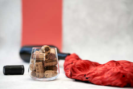 Russia, Naberezhnye Chelny, February 17, 2021: a glass with corks from wine bottles next to a dark bottle from which wine is poured from a silk fabric. Selective focus. Copy space.