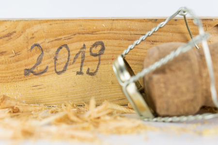 Cork from the bottle with the number 2018 indicating the year on the mottled light surface top view/ Celebration of the new year