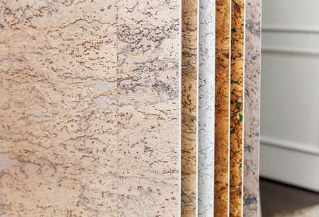 Cork sheets are stacked, creating an interesting staircase-like pattern with their natural texture