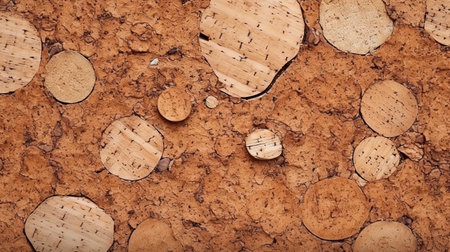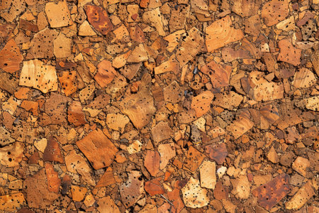 A beautifully textured cork mosaic featuring a variety of natural earth tones and organic shapes, ideal for a warm background.